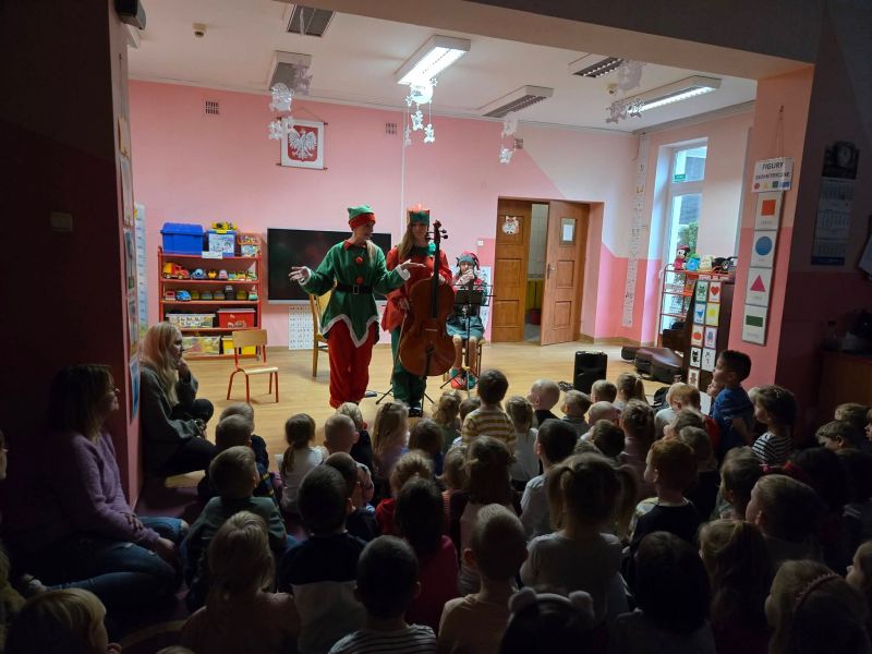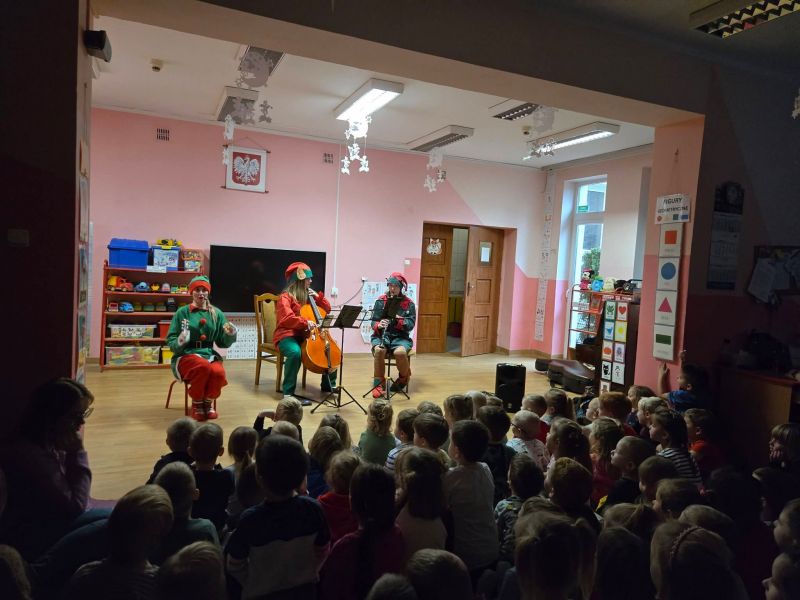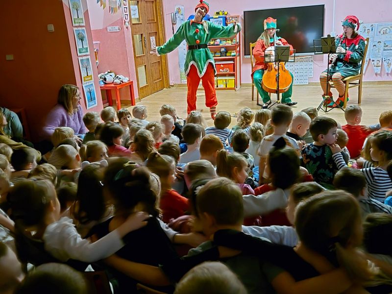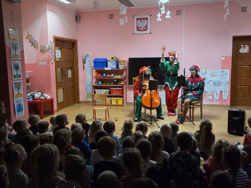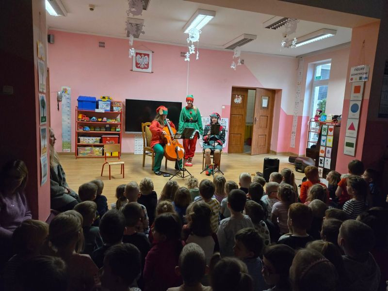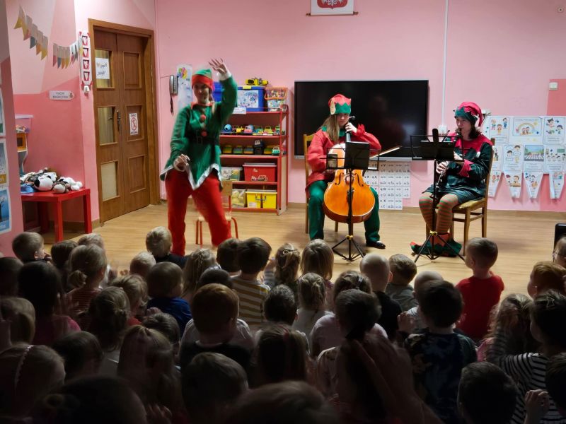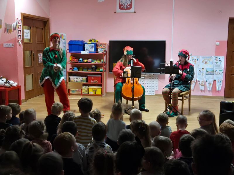 Pierwszego grudnia świąteczny koncert Elfów w naszym przedszkolu, troszkę opowieści, zapoznanie z tradycją zbilżających sìę świąt przy akompaniamencie klarnetu i wiolonczeli.