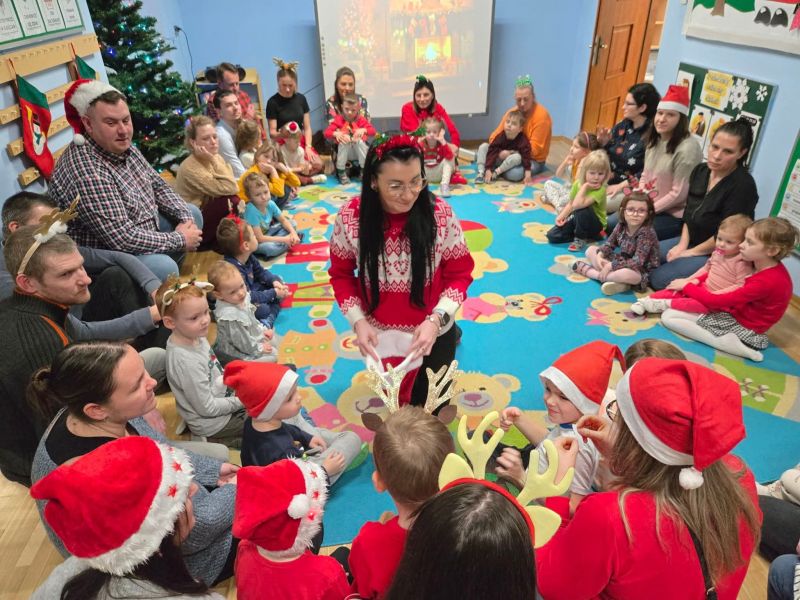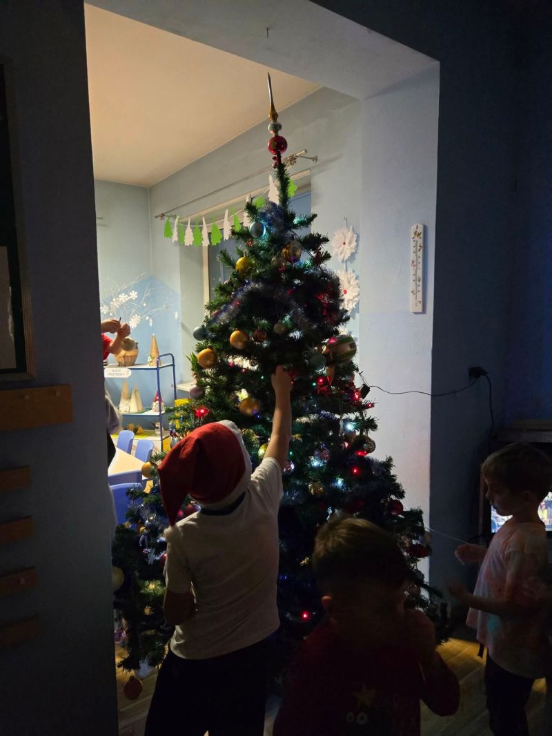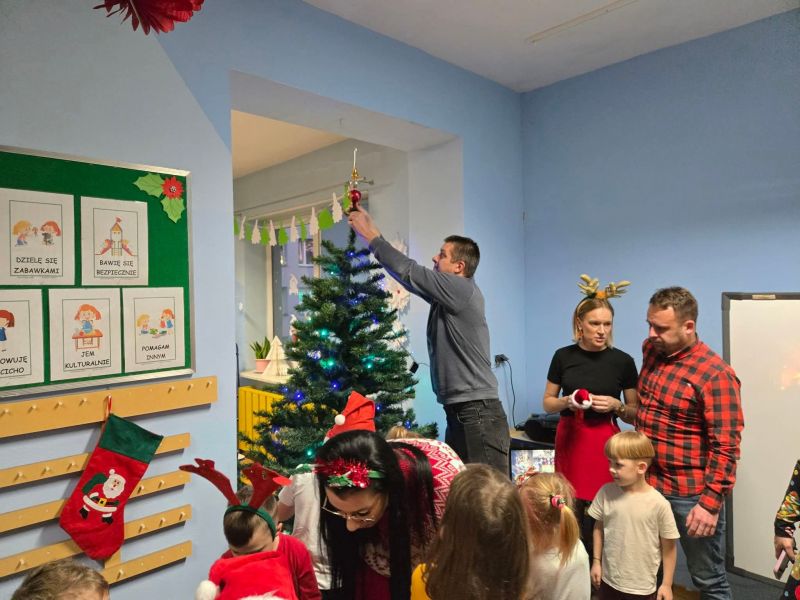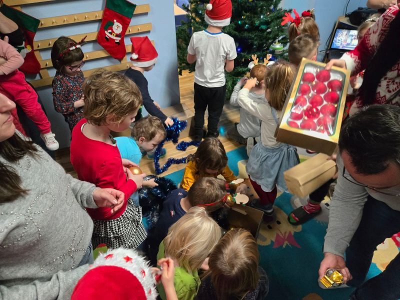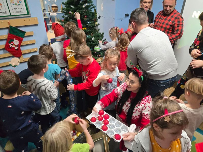 Wspólnie z dziećmi i rodzicami ubraliśmy choinkę, tworząc prawdziwie magiczną, bożonarodzeniową atmosferę w sali „myszek". Było mnóstwo uśmiechów, kreatywnej zabawy, kolorowych ozdób i świątecznego nastroju, który na długo zostanie w naszych sercach.
