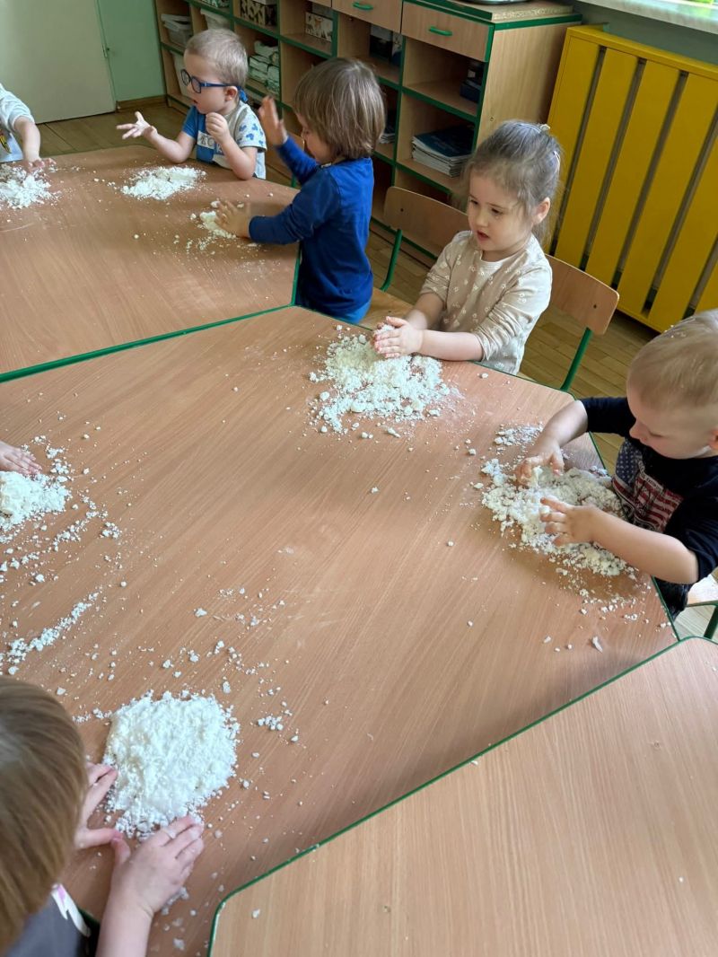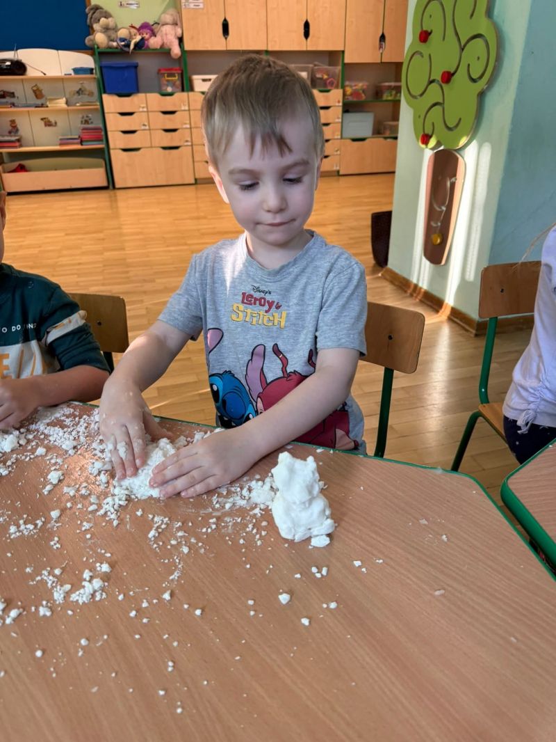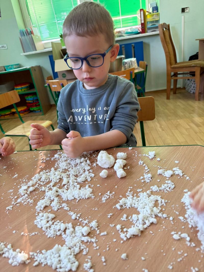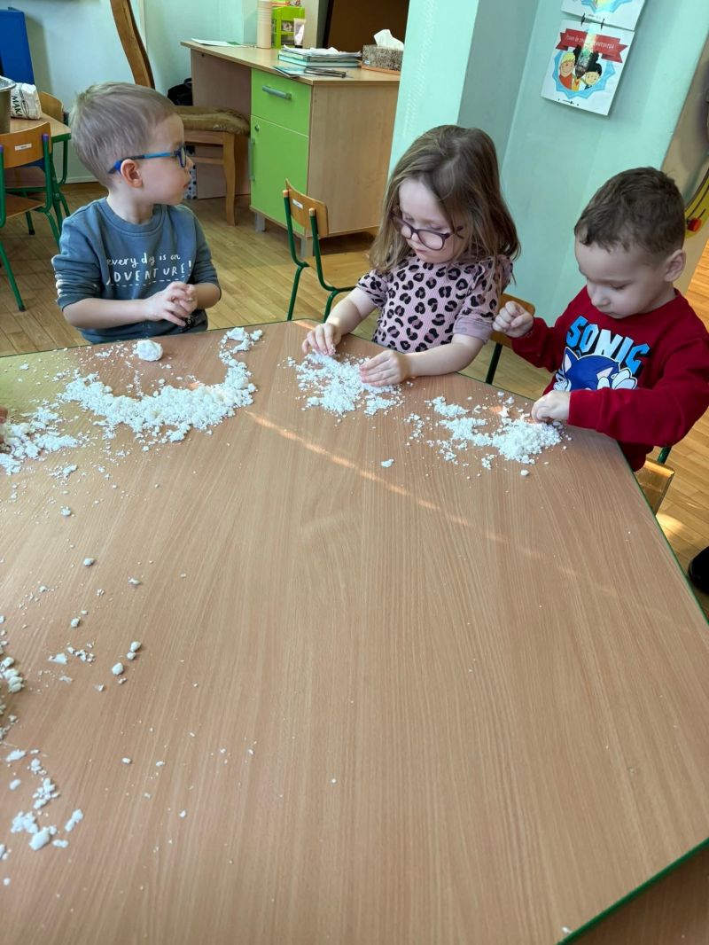 Dziś w naszej sali zrobiło się prawdziwie zimowo! Maluchy świętowały Dzień Bałwana, tworząc własny sztuczny śnieg, a potem z wielkim zaangażowaniem dotykały, ugniatały, przesypywały i próbowały ulepić swoje bałwanki