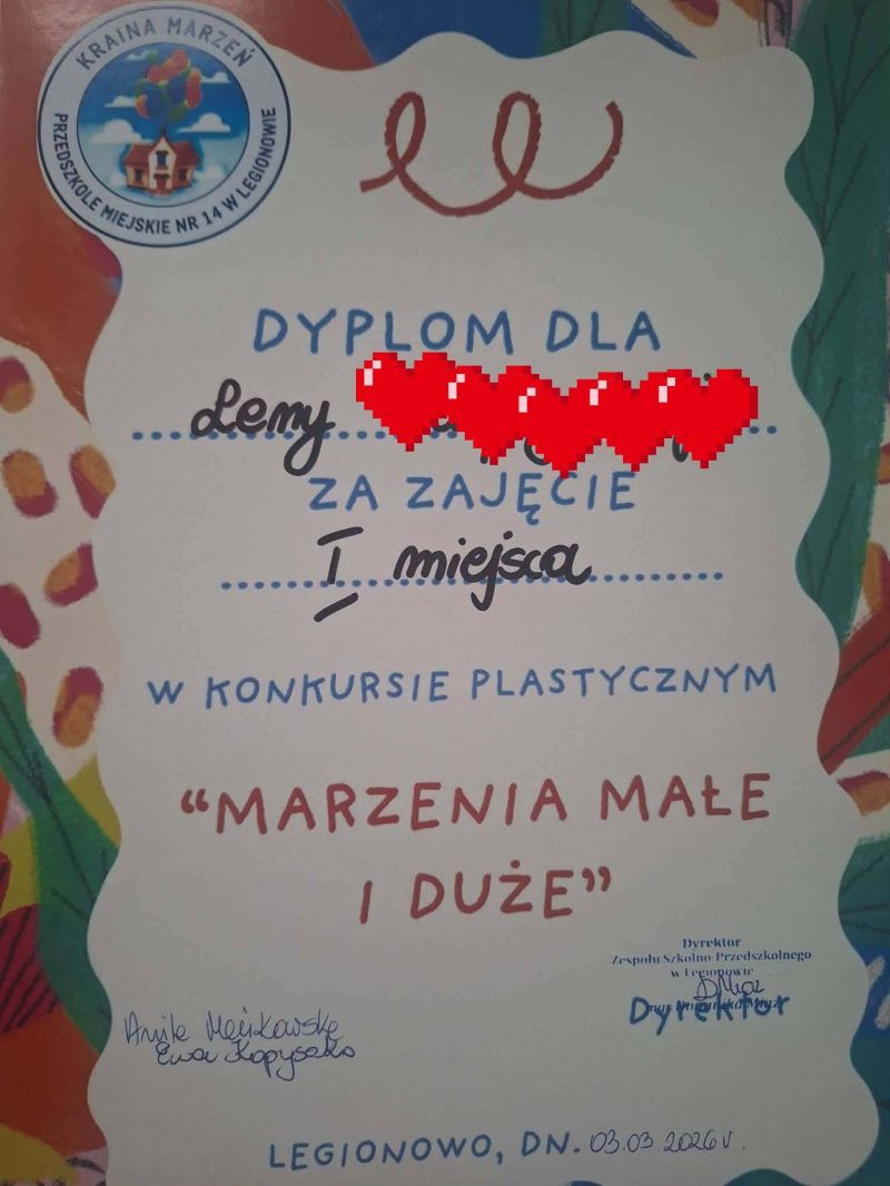 Wielkie brawa dla Lenki z gr. Motylki za zajecie I miejsca w konkursie plastycznym "Marzenia małe i duże"
